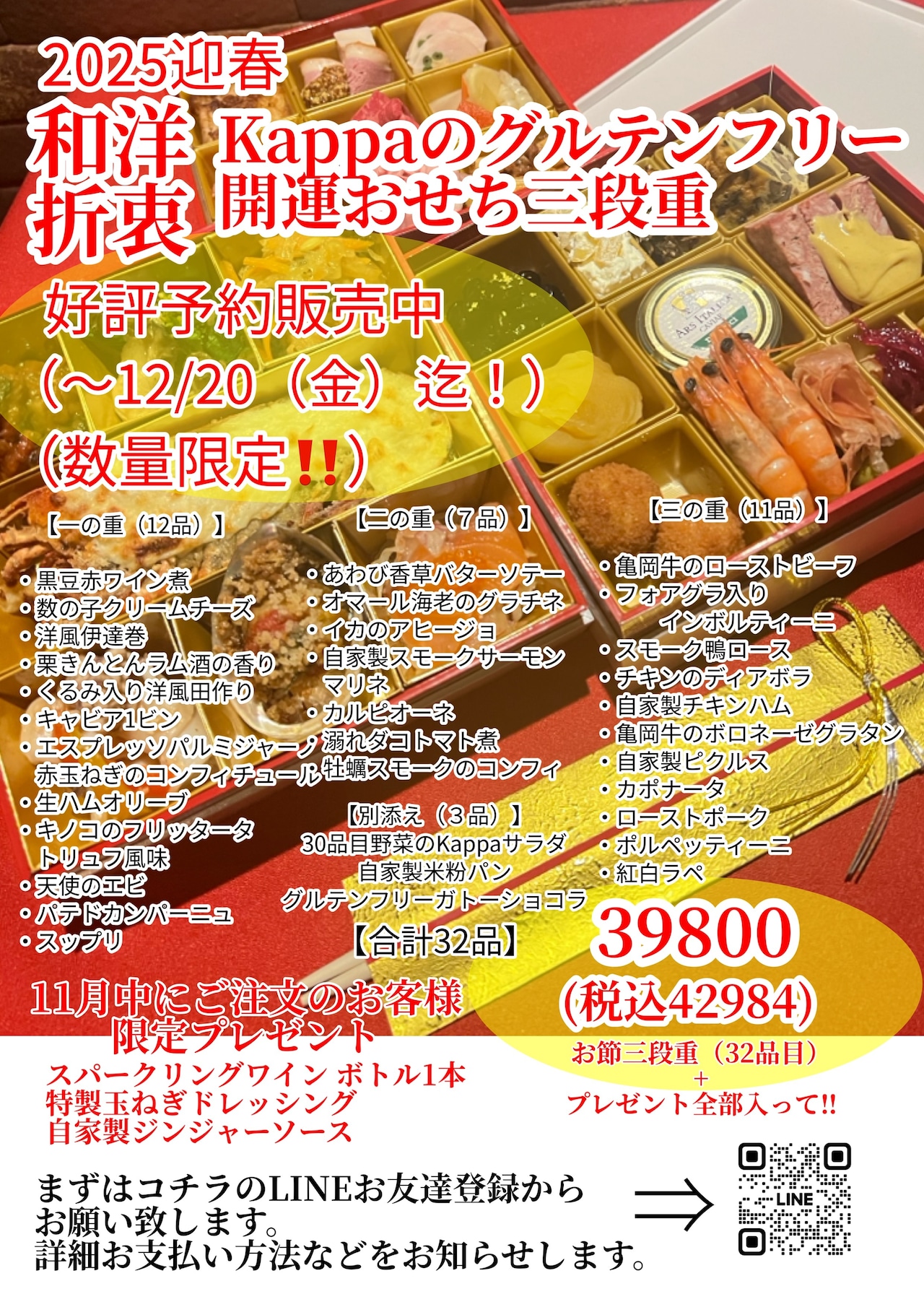 2026年Kappa開運お節❣️Kappaが初の開運お節を手掛けます‼️、伝統的な日本の味と現代のスタイルを融合させ、あたなの新年を特別なものにします。その秘密は、厳選された食材を用いた職人の技と心を込めた手作り、かつグルテンフリーを実現します。