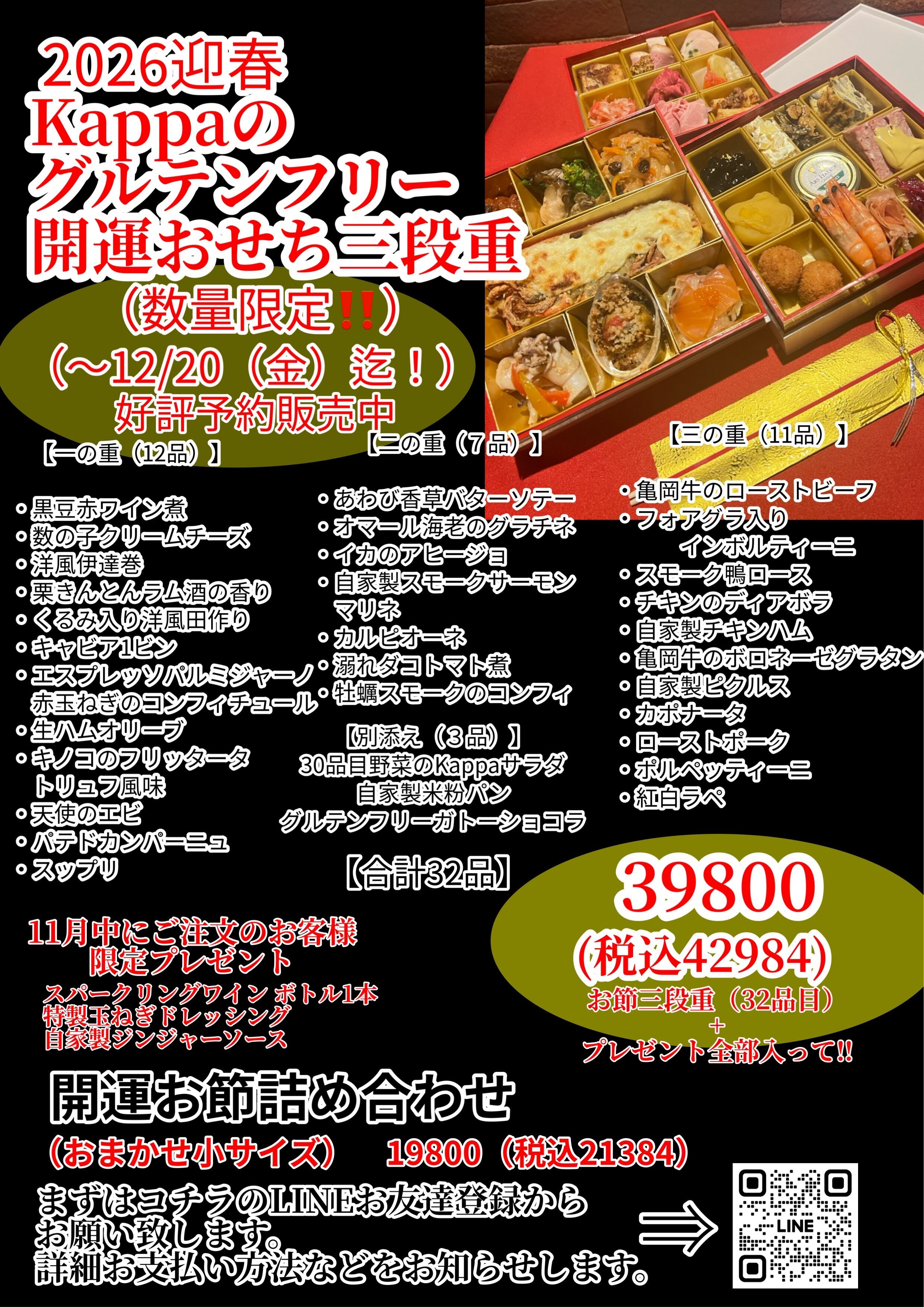 Kappaの開運お節は、忙しい現代のライフスタイルに寄り添います。自宅で気軽に美味しいお節料理を楽しむことができます。ぜひ、この特別な時間をお楽しみいただくためにお召し上がりください。